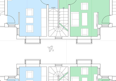 Ceci est une autre proposition de la série Universal Apartment. Les services se déplacent vers les murs extérieurs, permettant un espace intérieur plus utilisable avec un espace de mouvement minimal entre la porte d'accès et la cage d'escalier intérieure. L'ajout de cuisines et/ou de salles de bains permet à l'unité spatiale de base d'être utilisée de différentes manières et comme différentes parties d'une grande habitation et/ou d'un bureau. Toutes les zones habitables ont des fenêtres donnant sur les halls d'accès et le couloir. Les niveaux intermédiaire et supérieur sont également dotés de baies vitrées en saillie qui permettent aux personnes à l'intérieur des appartements et à celles de l'espace d'accès partagé d'avoir une conscience de la présence de l'autre.